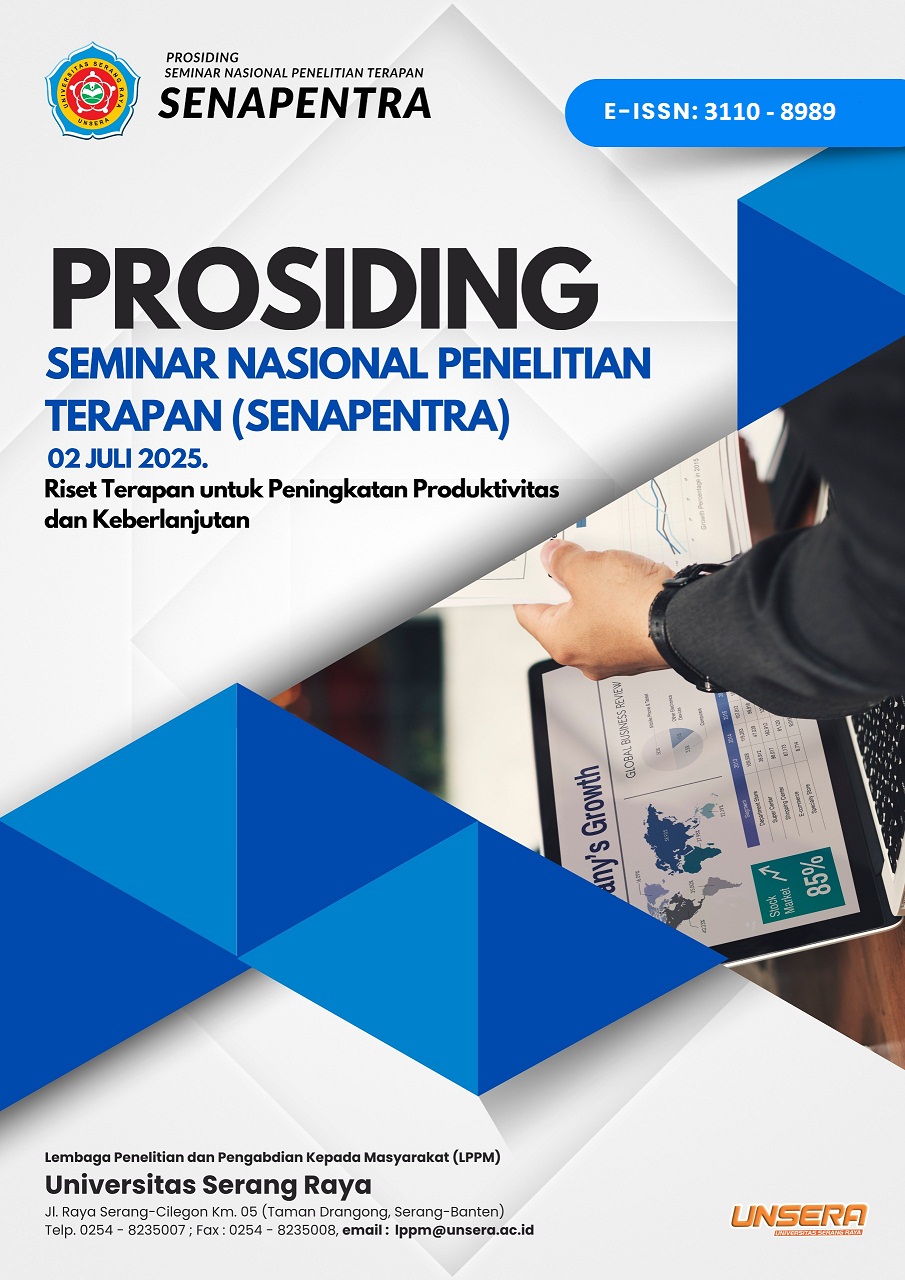 Kumpulan artikel penelitian yang dipublikasikan pada Seminar Tahunan yang diselenggarakan Lembaga Penelitian dan Pengabdian Masyarakat (LPPM) Universitas Serang Raya. Seluruh artikel yang dipresentasikan dalam kegiatan Seminar Nasional Penelitian dan Pengabdian, dipublikasikan melalui Open Journal System (OJS) Prosiding Seminar Nasional Penelitian Terapan (SENAPENTRA). Kegiatan Seminar Nasional dilaksanakan pada Rabu, 02 Juli 2025 yang bertempat di Gedung Rachmatoellah Convention Hall (RCH) Universitas Serang Raya.
